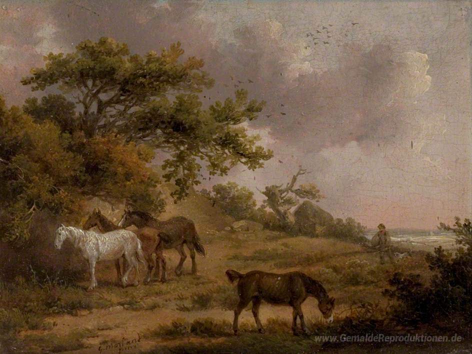 Wir bieten Ihnen eine handgefertigte Reproduktion auf Leinwand des berühmten Kunstwerks 'Landschaft mit vier Pferden' von George Morland, aus dem Reproduktionsmuseum.