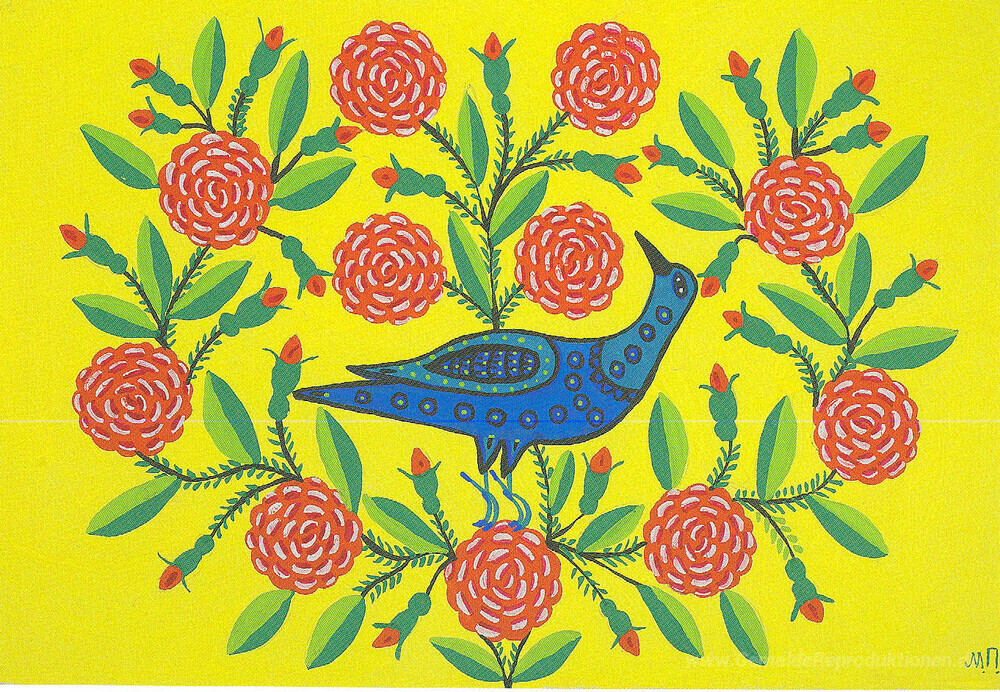 Wir bieten Ihnen eine handgefertigte Reproduktion auf Leinwand des berühmten Kunstwerks 'Magpie in Roses' von Maria Primachenko, aus dem Reproduktionsmuseum.