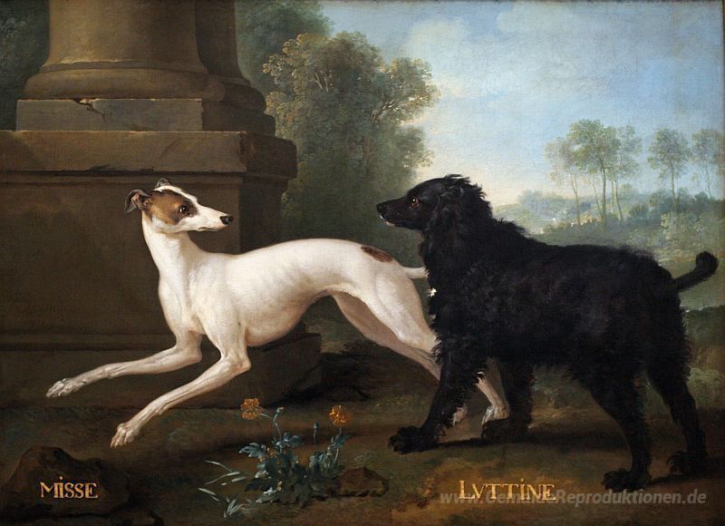 Wir bieten Ihnen eine handgefertigte Reproduktion auf Leinwand des berühmten Kunstwerks 'Missy und Luttine' von Jean-Baptiste Oudry, aus dem Reproduktionsmuseum.