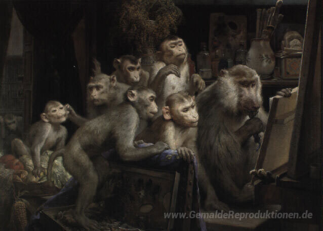 Wir bieten Ihnen eine handgefertigte Reproduktion auf Leinwand des berühmten Kunstwerks 'Monkeys und Malerei' von Gabriel von Max, aus dem Reproduktionsmuseum.