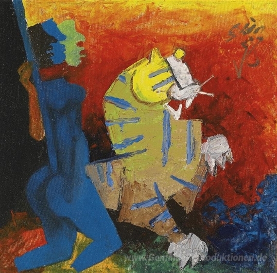 Willkommen in unserer exklusiven Sammlung von Ölgemälden, wo zeitlose Kunst auf moderne Wohnambiente trifft. Eines der herausragenden Werke unserer Kollektion ist das faszinierende Gemälde Ohne Titel (Blau Abbildung und Tiger) des renommierten Künstlers M.F. Husain. Bekannt für seinen einzigartigen Stil, der traditionelle indische Motive mit zeitgenössischen Elementen verbindet, entfaltet Husain in diesem Werk eine lebendige Farbharmonie, die das Auge fesselt und zum Nachdenken anregt.