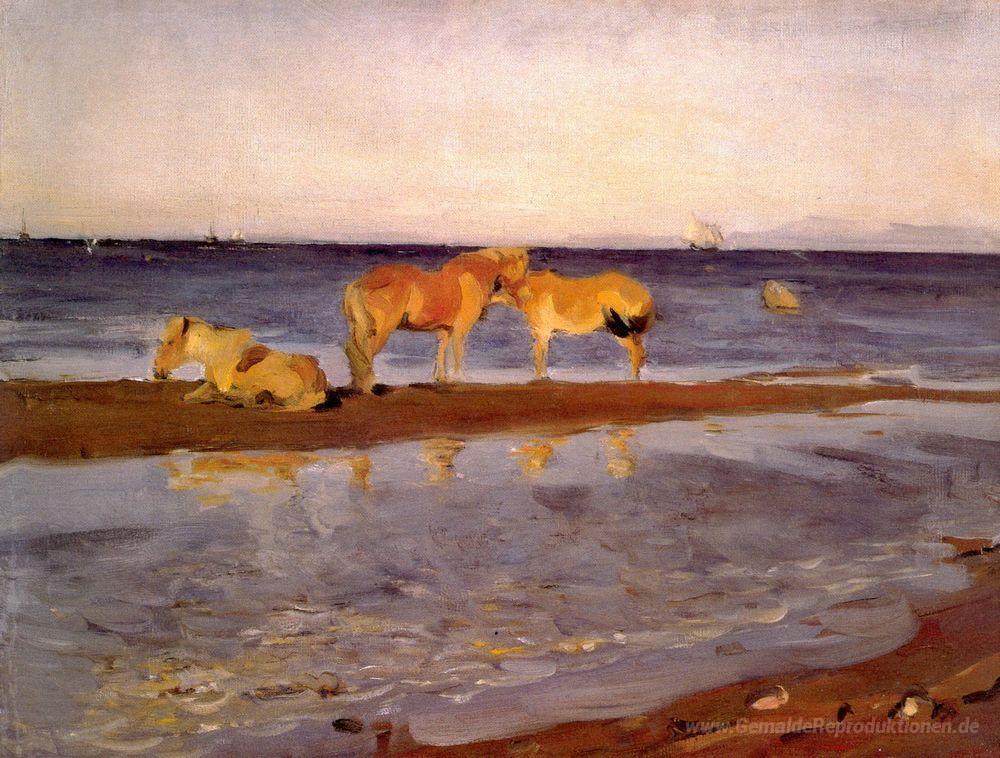 Wir bieten Ihnen eine handgefertigte Reproduktion auf Leinwand des berühmten Kunstwerks 'Pferde auf einer Shore' von Valentin Serov, aus dem Reproduktionsmuseum.