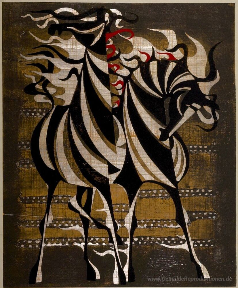 Wir bieten Ihnen eine handgefertigte Reproduktion auf Leinwand des berühmten Kunstwerks 'Pferde in den Nachmittag' von Tadashi Nakayama, aus dem Reproduktionsmuseum.