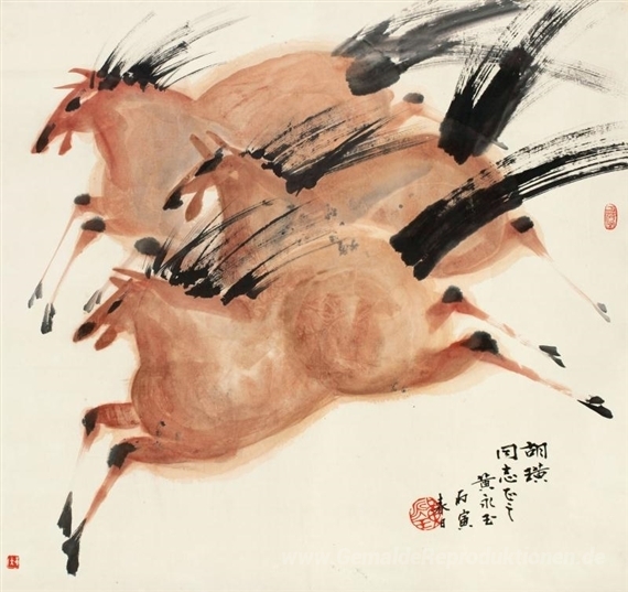 Wir bieten Ihnen eine handgefertigte Reproduktion auf Leinwand des berühmten Kunstwerks 'Pferde' von Huang Yongyu, aus dem Reproduktionsmuseum.