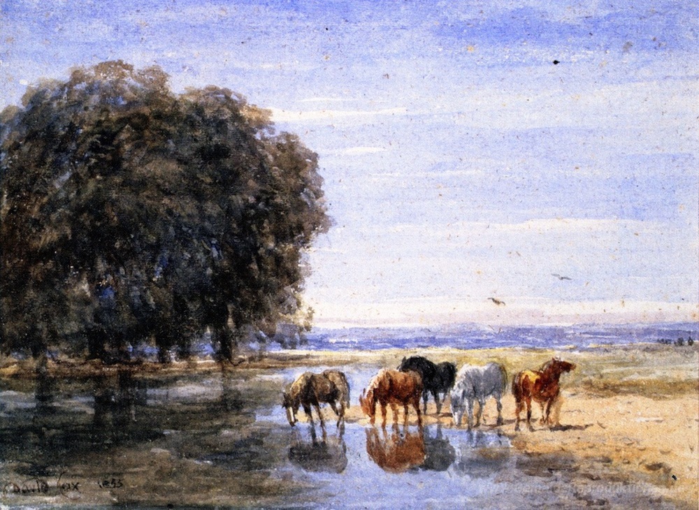 Wir bieten Ihnen eine handgefertigte Reproduktion auf Leinwand des berühmten Kunstwerks 'Pferde Trinken' von David Cox, aus dem Reproduktionsmuseum.