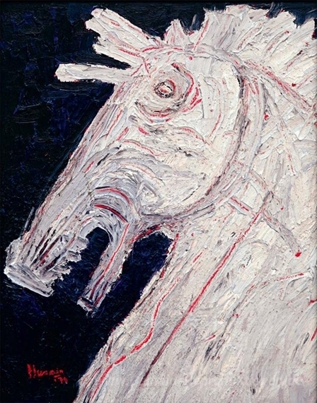 Wir bieten Ihnen eine handgefertigte Reproduktion auf Leinwand des berühmten Kunstwerks 'Pferdekopf' von M.F. Husain, aus dem Reproduktionsmuseum.