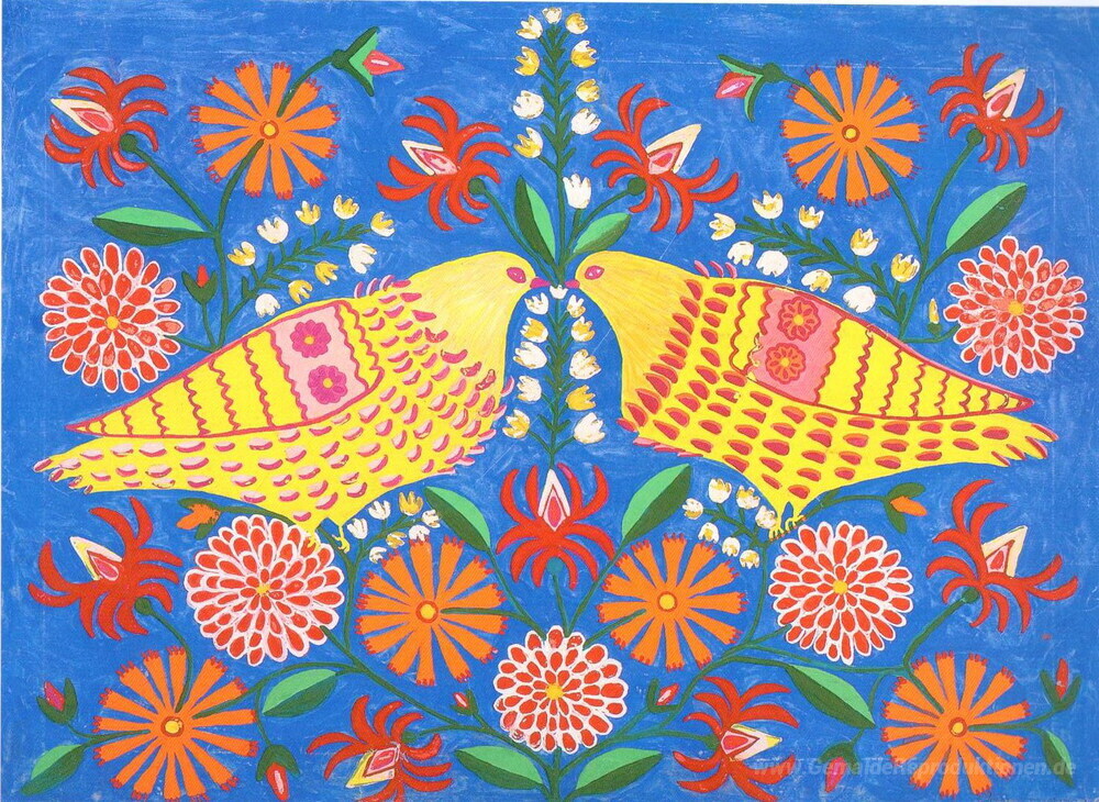 Wir bieten Ihnen eine handgefertigte Reproduktion auf Leinwand des berühmten Kunstwerks 'Pigeons' von Maria Primachenko, aus dem Reproduktionsmuseum.