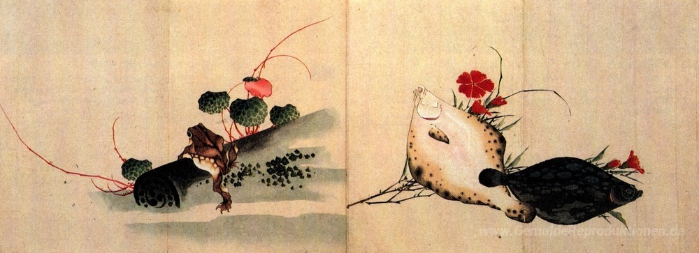 Jedes von Hokusais Gemälden ist mehr als nur ein Wandbild; es ist ein Fenster in eine andere Welt. Die harmonische Komposition und die sorgfältige Ausführung schaffen eine Atmosphäre der Ruhe und Inspiration, die jeden Raum bereichert. Lassen Sie sich von der Magie des Plattfisch und rosa verzaubern und erleben Sie, wie ein Kunstwerk Ihren Lebensraum transformiert und eine einladende, kreative Stimmung erzeugt.