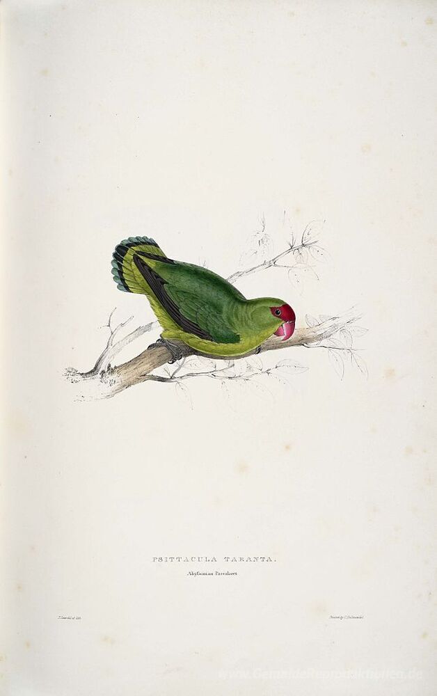 Wir bieten Ihnen eine handgefertigte Reproduktion auf Leinwand des berühmten Kunstwerks 'Psittacula Taranta. Abessinier Parrakeet (Abessinier Lovebird)' von Edward Lear, aus dem Reproduktionsmuseum.