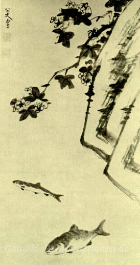 Wir bieten Ihnen eine handgefertigte Reproduktion auf Leinwand des berühmten Kunstwerks 'Rock and Two Fish' von Bada Shanren, aus dem Reproduktionsmuseum.