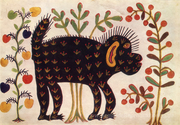 Wir bieten Ihnen eine handgefertigte Reproduktion auf Leinwand des berühmten Kunstwerks 'Schwarz Affe' von Maria Primachenko, aus dem Reproduktionsmuseum.