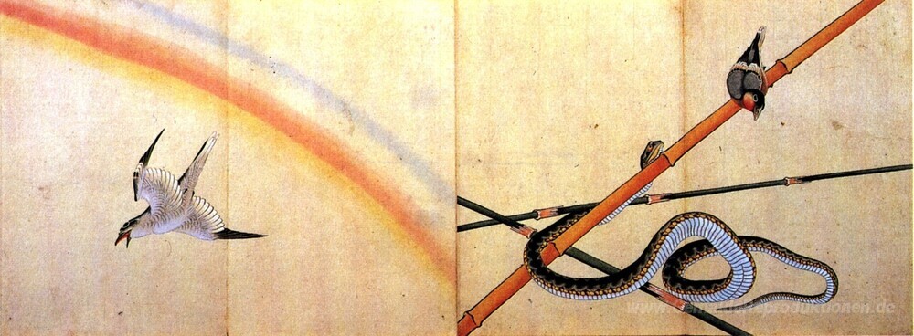Wir bieten Ihnen eine handgefertigte Reproduktion auf Leinwand des berühmten Kunstwerks 'Snake Curling um einen Bambusstiel mit einem Spatz auf sie' von Katsushika Hokusai, aus dem Reproduktionsmuseum.