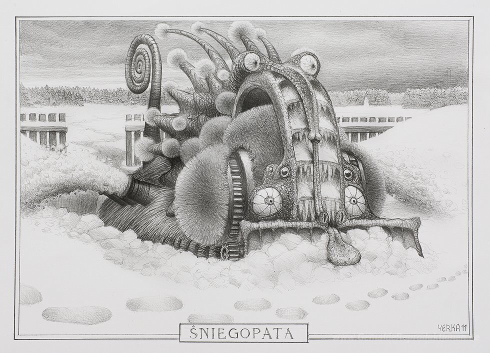 Wir bieten Ihnen eine handgefertigte Reproduktion auf Leinwand des berühmten Kunstwerks 'Snovel' von Jacek Yerka, aus dem Reproduktionsmuseum.