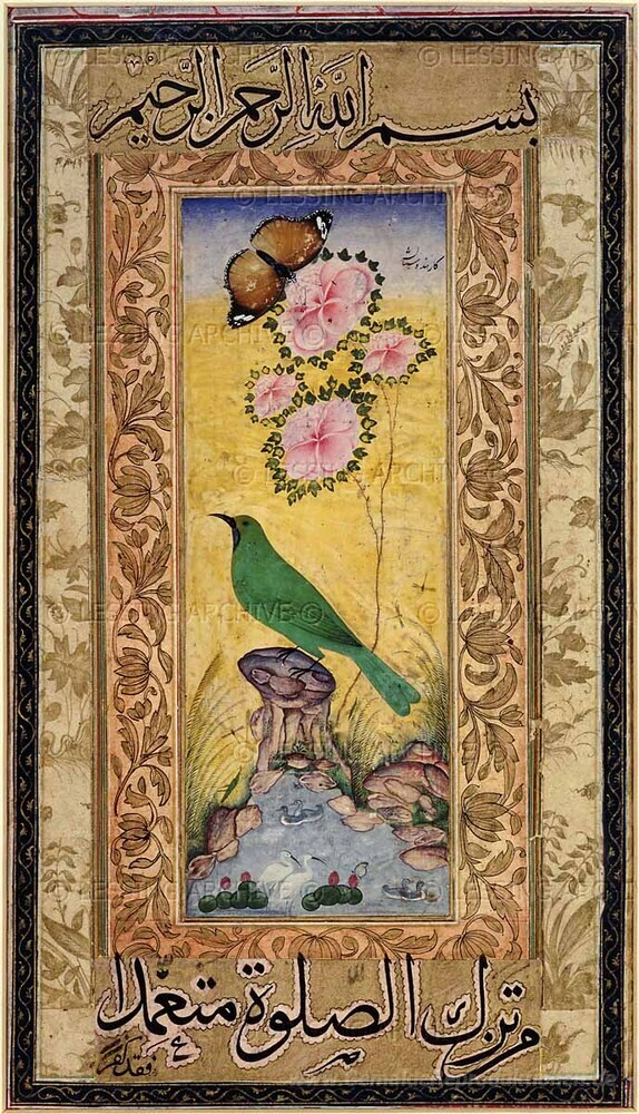 Wir bieten Ihnen eine handgefertigte Reproduktion auf Leinwand des berühmten Kunstwerks 'Studie über eine Gold-überzogenes Chloropsis' von Ustad Mansur, aus dem Reproduktionsmuseum.