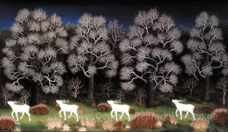 Wir bieten Ihnen eine handgefertigte Reproduktion auf Leinwand des berühmten Kunstwerks 'The Deer Hochzeit' von Ivan Generalic, aus dem Reproduktionsmuseum.