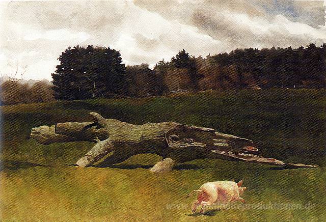 Wir bieten Ihnen eine handgefertigte Reproduktion auf Leinwand des berühmten Kunstwerks 'The Runaway Pig' von Jamie Wyeth, aus dem Reproduktionsmuseum.