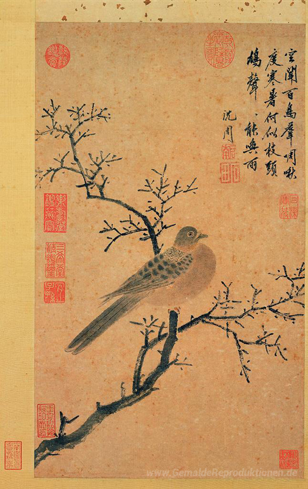 Wir bieten Ihnen eine handgefertigte Reproduktion auf Leinwand des berühmten Kunstwerks 'Turtledove Aufruf für Regen' von Shen Zhou, aus dem Reproduktionsmuseum.