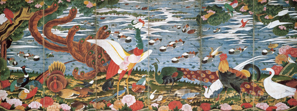 Wir bieten Ihnen eine handgefertigte Reproduktion auf Leinwand des berühmten Kunstwerks 'Vögel, Tiere und Blütenpflanzen in Imaginary Szene' von Ito Jakuchu, aus dem Reproduktionsmuseum.