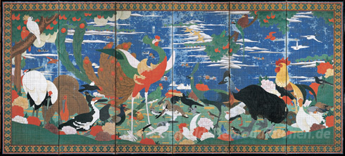 Wir bieten Ihnen eine handgefertigte Reproduktion auf Leinwand des berühmten Kunstwerks 'Vögel, Tiere und Blütenpflanzen in Imaginary Szene' von Ito Jakuchu, aus dem Reproduktionsmuseum.