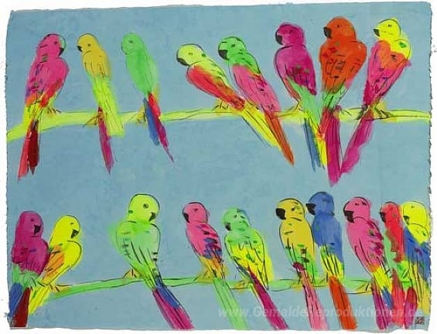 Wir bieten Ihnen eine handgefertigte Reproduktion auf Leinwand des berühmten Kunstwerks 'Viele Papageien' von Walasse Ting, aus dem Reproduktionsmuseum.