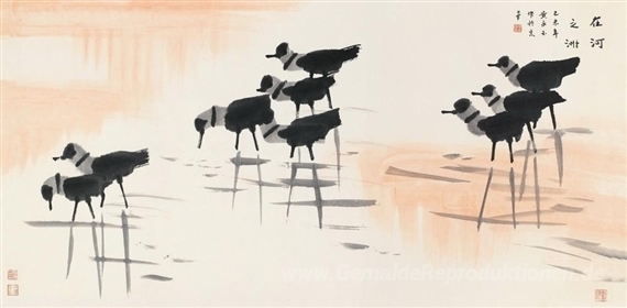 Die Verwendung lebendiger Farben und sorgfältig ausgearbeiteter Details lädt den Betrachter ein, in die Darstellung der Wasservögel einzutauchen. Dieses Kunstwerk hat das Potenzial, jeden Raum zu bereichern und eine ruhige, inspirierende Umgebung zu schaffen. Entdecken Sie mit Wasservögel von Huang Yongyu nicht nur einen visuellen Genuss, sondern auch einen Ausdruck von Lebensfreude, der die Stimmung und Atmosphäre Ihres Zuhauses positiv beeinflusst.
