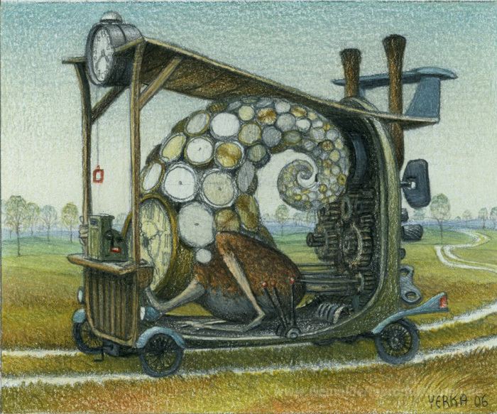 Wir bieten Ihnen eine handgefertigte Reproduktion auf Leinwand des berühmten Kunstwerks 'Wecker Wandering Verkäufer' von Jacek Yerka, aus dem Reproduktionsmuseum.
