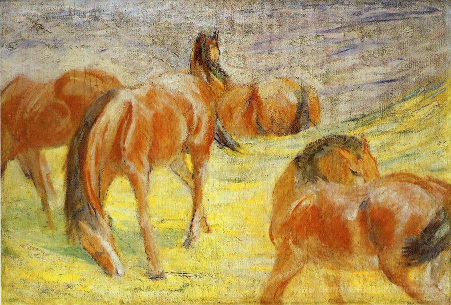 Wir bieten Ihnen eine handgefertigte Reproduktion auf Leinwand des berühmten Kunstwerks 'Weidende Pferde' von Franz Marc, aus dem Reproduktionsmuseum.