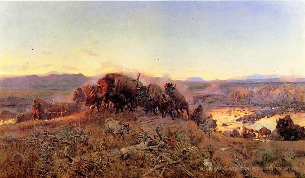 Wir bieten Ihnen eine handgefertigte Reproduktion auf Leinwand des berühmten Kunstwerks 'Wenn das Land gehörte zu Gott' von Charles M. Russell, aus dem Reproduktionsmuseum.