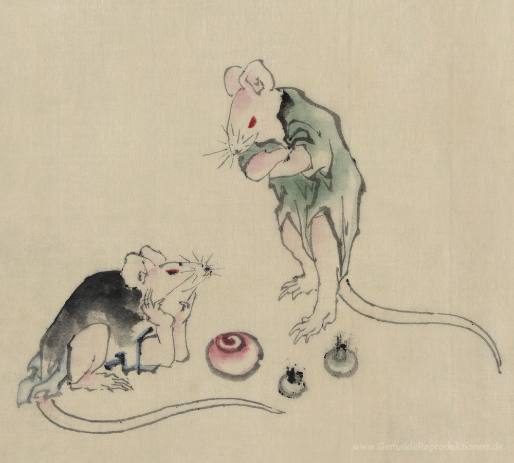 Wir bieten Ihnen eine handgefertigte Reproduktion auf Leinwand des berühmten Kunstwerks 'Zwei Mäuse, einer auf dem Boden liegend mit Kopf auf die Vorderp' von Katsushika Hokusai, aus dem Reproduktionsmuseum.