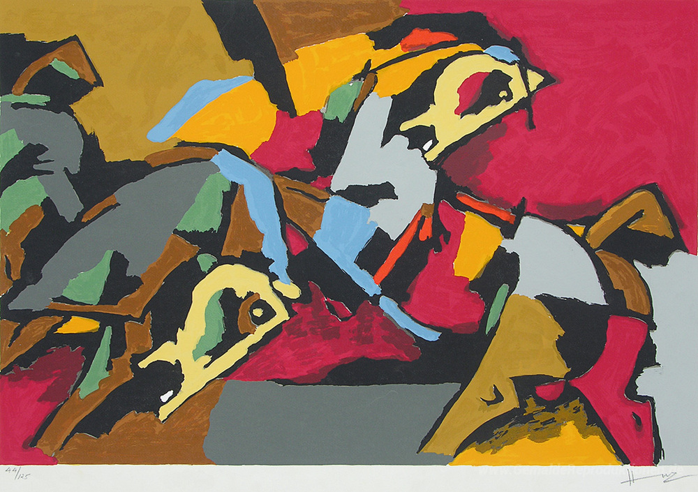 Wir bieten Ihnen eine handgefertigte Reproduktion auf Leinwand des berühmten Kunstwerks 'Zwei Pferde' von M.F. Husain, aus dem Reproduktionsmuseum.