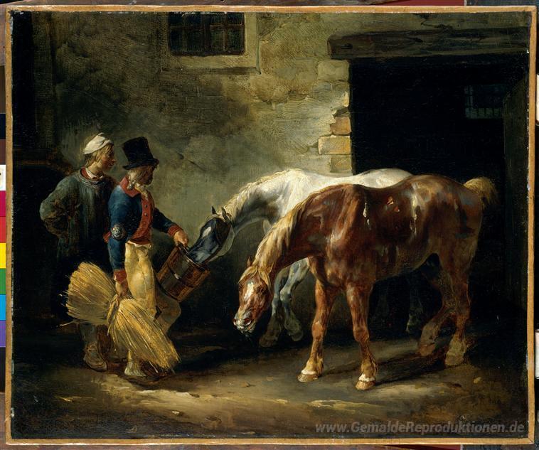 Wir bieten Ihnen eine handgefertigte Reproduktion auf Leinwand des berühmten Kunstwerks 'Zwei Postpferde im Stall' von Theodore Gericault, aus dem Reproduktionsmuseum.