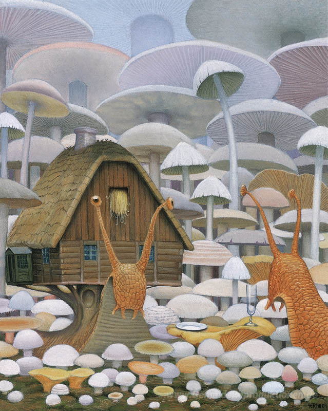 Wir bieten Ihnen eine handgefertigte Reproduktion auf Leinwand des berühmten Kunstwerks 'Zwei Schnecken' von Jacek Yerka, aus dem Reproduktionsmuseum.