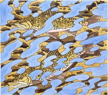 Wir bieten Ihnen eine handgefertigte Reproduktion auf Leinwand des berühmten Kunstwerks 'Zwei Trout & Spiegelung' von Neil Welliver, aus dem Reproduktionsmuseum.