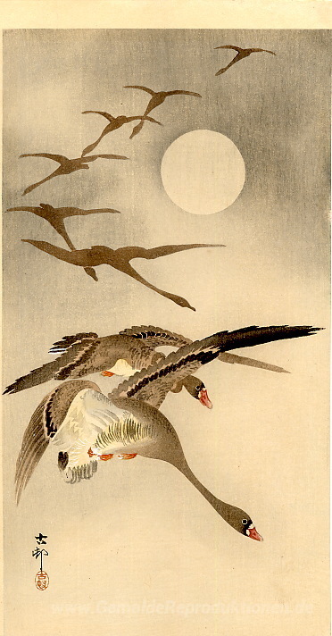 Wir bieten Ihnen eine handgefertigte Reproduktion auf Leinwand des berühmten Kunstwerks 'Acht Weiß-konfrontierte Gänse im Flug; Vollmond hinter' von Ohara Koson, aus dem Reproduktionsmuseum.