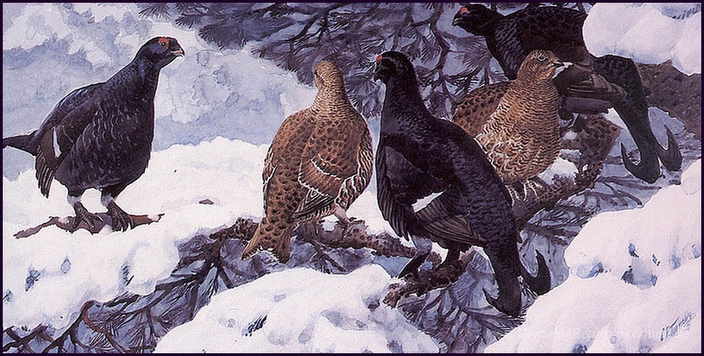 Wir bieten Ihnen eine handgefertigte Reproduktion auf Leinwand des berühmten Kunstwerks 'Black Grouse' von Charles Tunnicliffe, aus dem Reproduktionsmuseum.