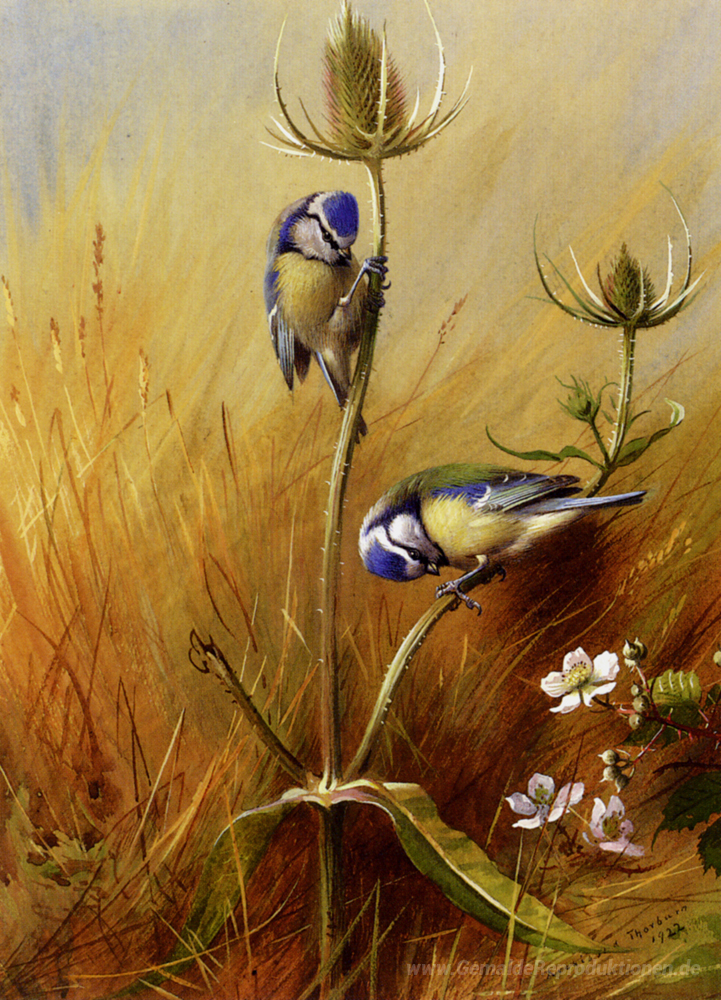 Wir bieten Ihnen eine handgefertigte Reproduktion auf Leinwand des berühmten Kunstwerks 'Bluetits Auf Teasel' von Archibald Thorburn, aus dem Reproduktionsmuseum.