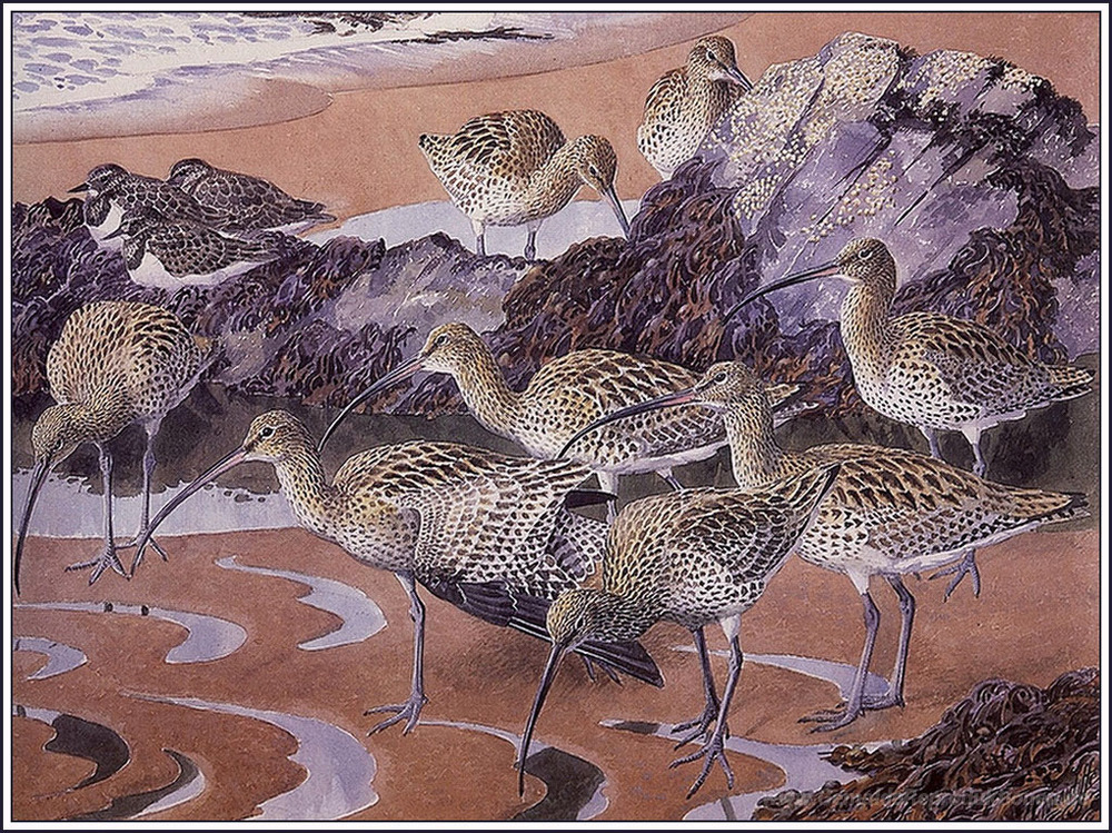 Wir bieten Ihnen eine handgefertigte Reproduktion auf Leinwand des berühmten Kunstwerks 'Brachvögel und Steinwälzer' von Charles Tunnicliffe, aus dem Reproduktionsmuseum.