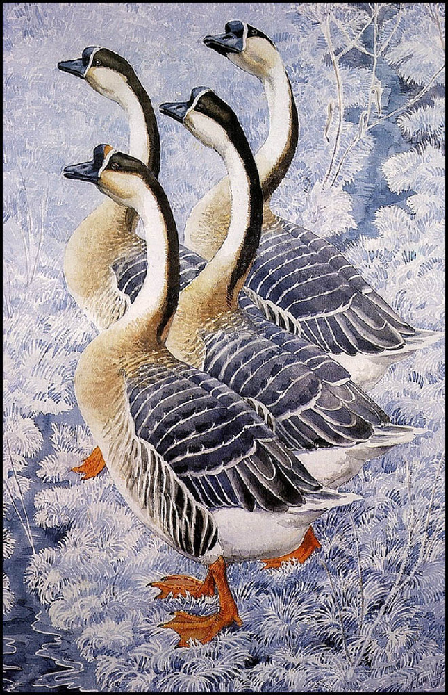 Wir bieten Ihnen eine handgefertigte Reproduktion auf Leinwand des berühmten Kunstwerks 'Chinese Geese' von Charles Tunnicliffe, aus dem Reproduktionsmuseum.