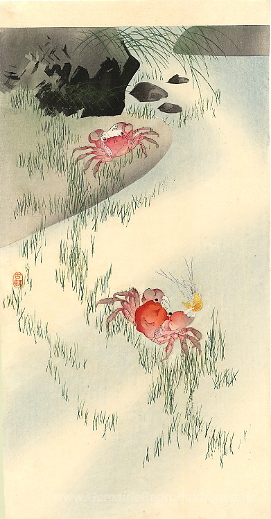 Wir bieten Ihnen eine handgefertigte Reproduktion auf Leinwand des berühmten Kunstwerks 'Crabs' von Ohara Koson, aus dem Reproduktionsmuseum.