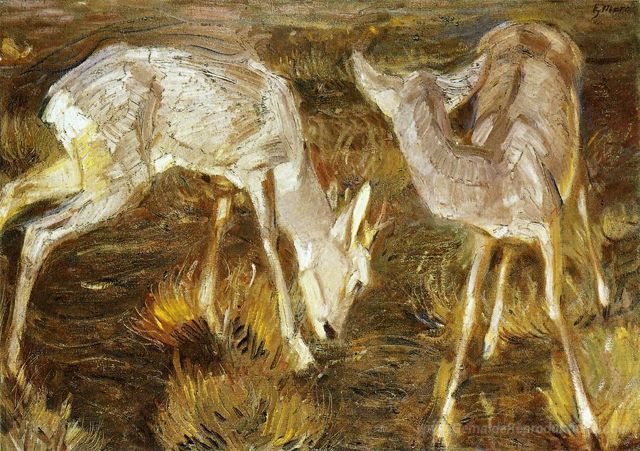 Wir bieten Ihnen eine handgefertigte Reproduktion auf Leinwand des berühmten Kunstwerks 'Deer in der Abenddämmerung' von Franz Marc, aus dem Reproduktionsmuseum.