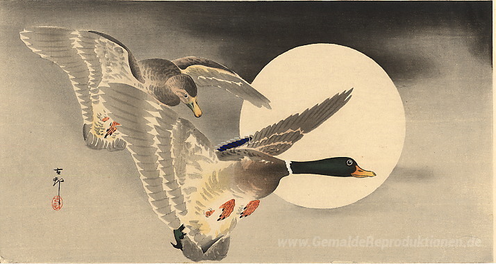 Wir bieten Ihnen eine handgefertigte Reproduktion auf Leinwand des berühmten Kunstwerks 'Gänse im Flug Vor einem Vollmond' von Ohara Koson, aus dem Reproduktionsmuseum.