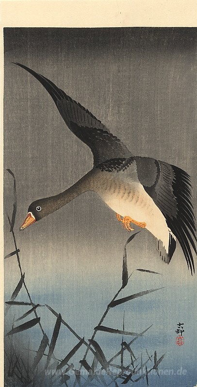 Wir bieten Ihnen eine handgefertigte Reproduktion auf Leinwand des berühmten Kunstwerks 'Gans absteigend über Schilf' von Ohara Koson, aus dem Reproduktionsmuseum.