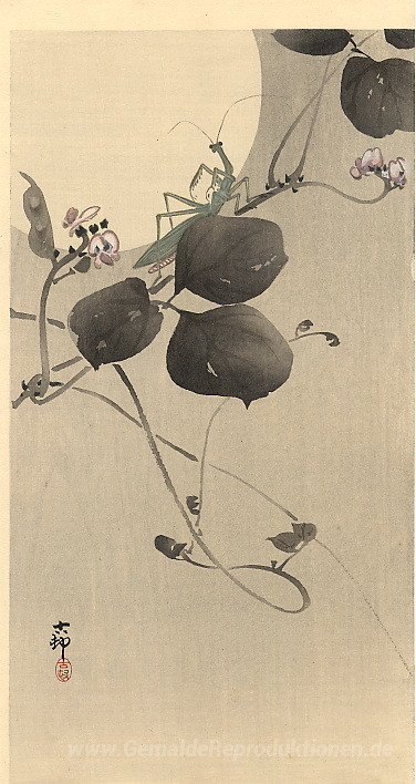 Wir bieten Ihnen eine handgefertigte Reproduktion auf Leinwand des berühmten Kunstwerks 'Gottesanbeterin' von Ohara Koson, aus dem Reproduktionsmuseum.