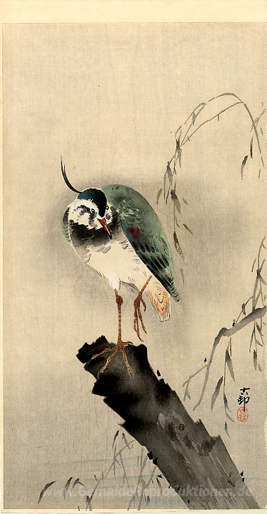 Wir bieten Ihnen eine handgefertigte Reproduktion auf Leinwand des berühmten Kunstwerks 'Kiebitz auf Baumstumpf' von Ohara Koson, aus dem Reproduktionsmuseum.