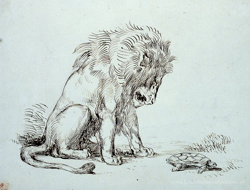Wir bieten Ihnen eine handgefertigte Reproduktion auf Leinwand des berühmten Kunstwerks 'Lion and Tortoise' von Eugene Delacroix, aus dem Reproduktionsmuseum.