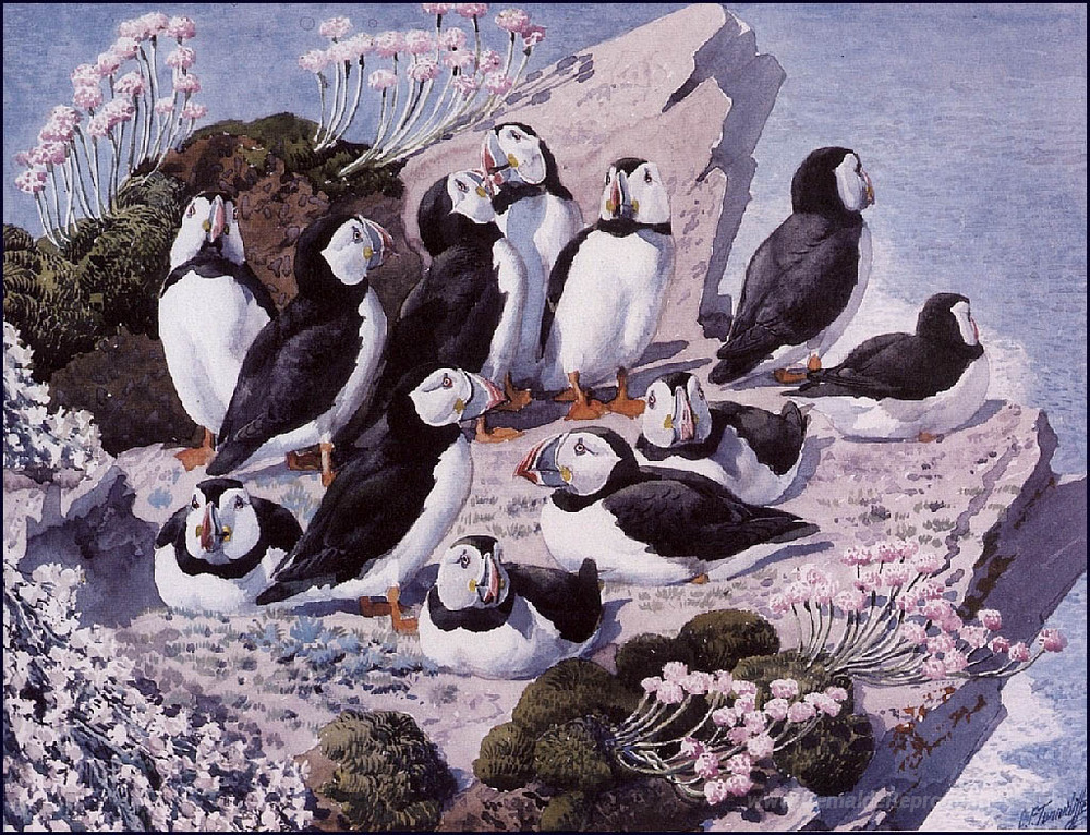 Wir bieten Ihnen eine handgefertigte Reproduktion auf Leinwand des berühmten Kunstwerks 'Papageientaucher-Kolonie' von Charles Tunnicliffe, aus dem Reproduktionsmuseum.
