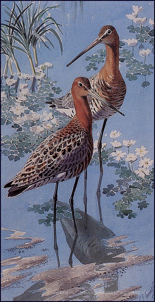 Wir bieten Ihnen eine handgefertigte Reproduktion auf Leinwand des berühmten Kunstwerks 'Schwarzes angebundene Goodwits' von Charles Tunnicliffe, aus dem Reproduktionsmuseum.