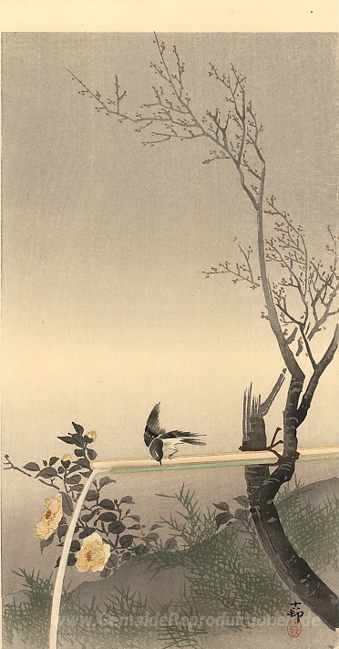 Wir bieten Ihnen eine handgefertigte Reproduktion auf Leinwand des berühmten Kunstwerks 'Schwarzkehlchen' von Ohara Koson, aus dem Reproduktionsmuseum.