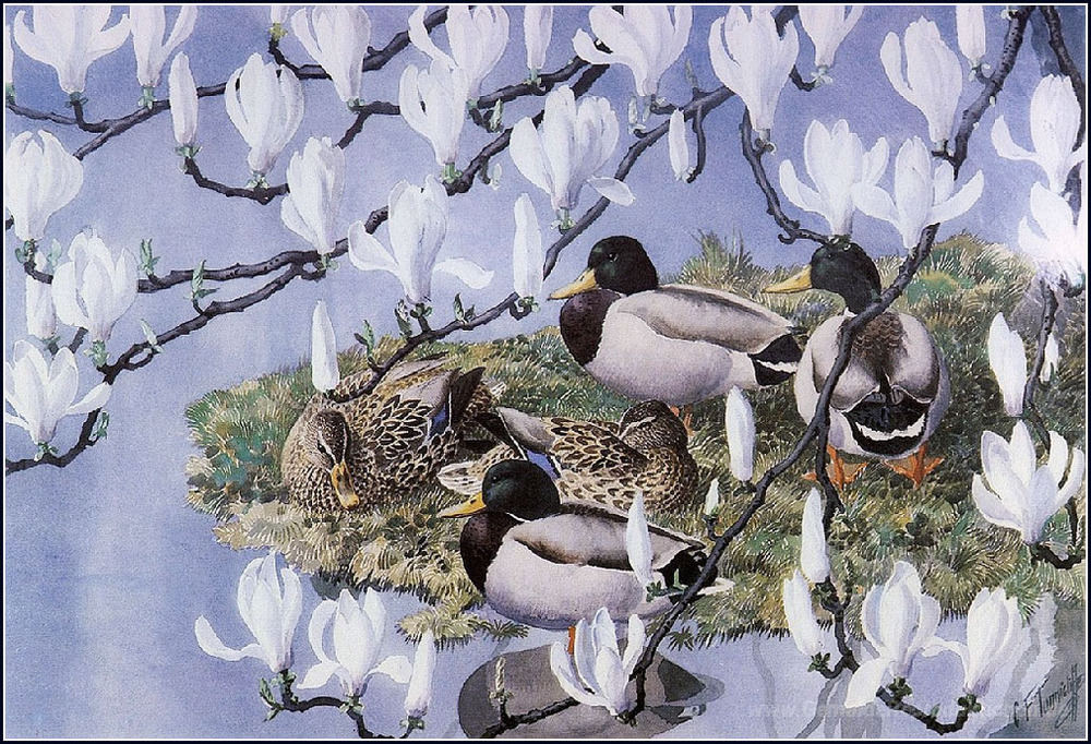 Wir bieten Ihnen eine handgefertigte Reproduktion auf Leinwand des berühmten Kunstwerks 'Stockenten und Magnolien' von Charles Tunnicliffe, aus dem Reproduktionsmuseum.