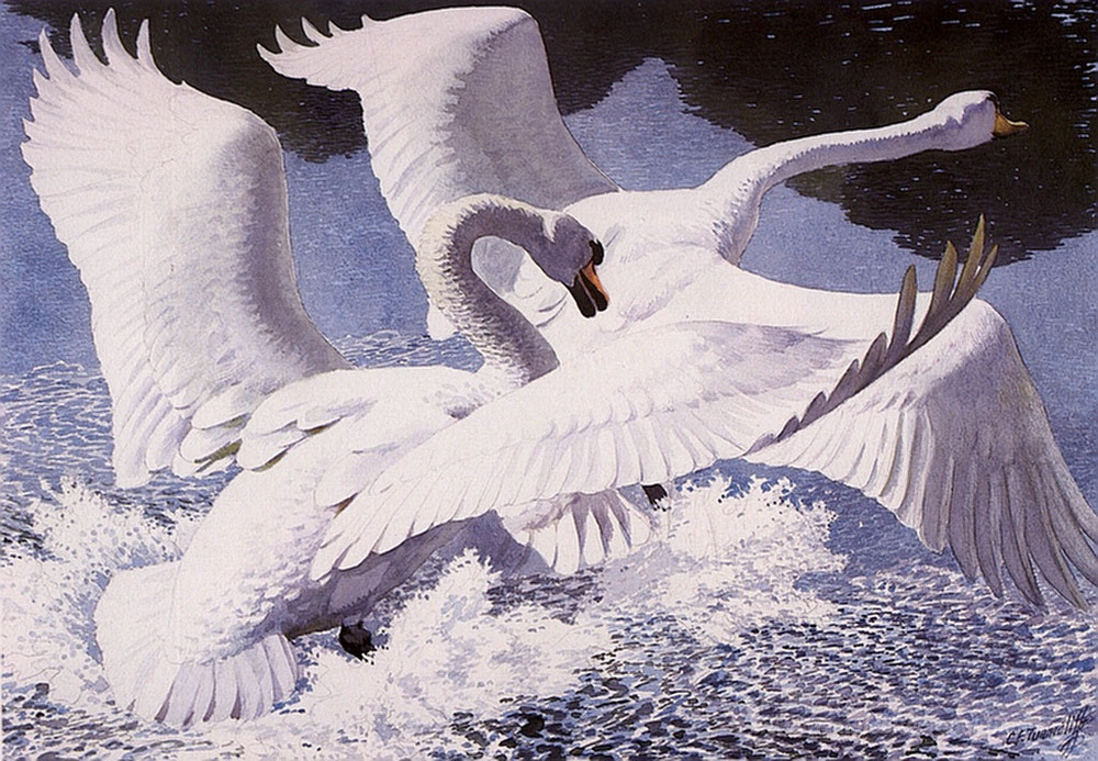 Wir bieten Ihnen eine handgefertigte Reproduktion auf Leinwand des berühmten Kunstwerks 'The Rivals' von Charles Tunnicliffe, aus dem Reproduktionsmuseum.